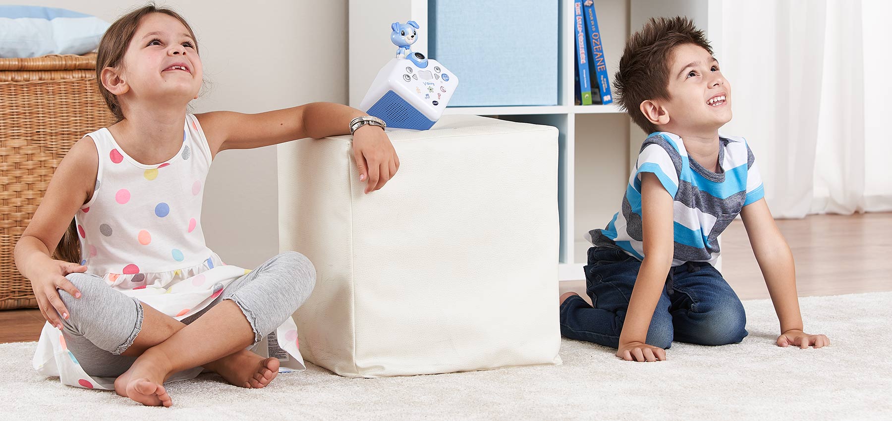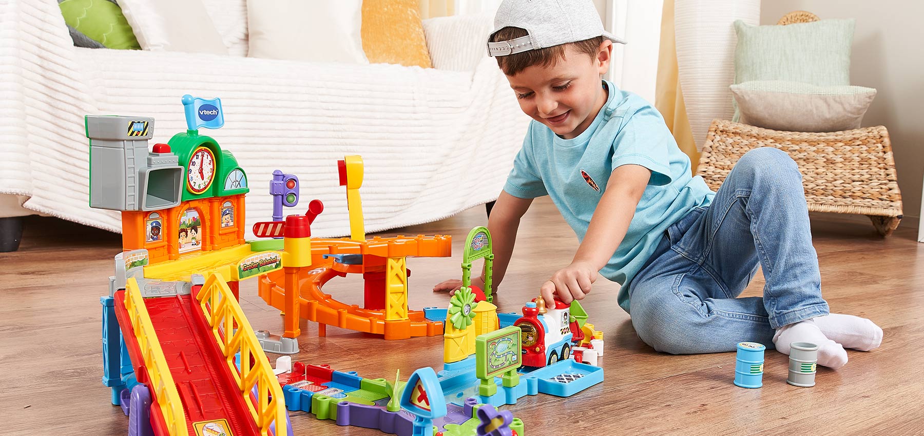 Haustiere, Babytablets, Sortierspielzeuge und Kinderbücher helfen dabei